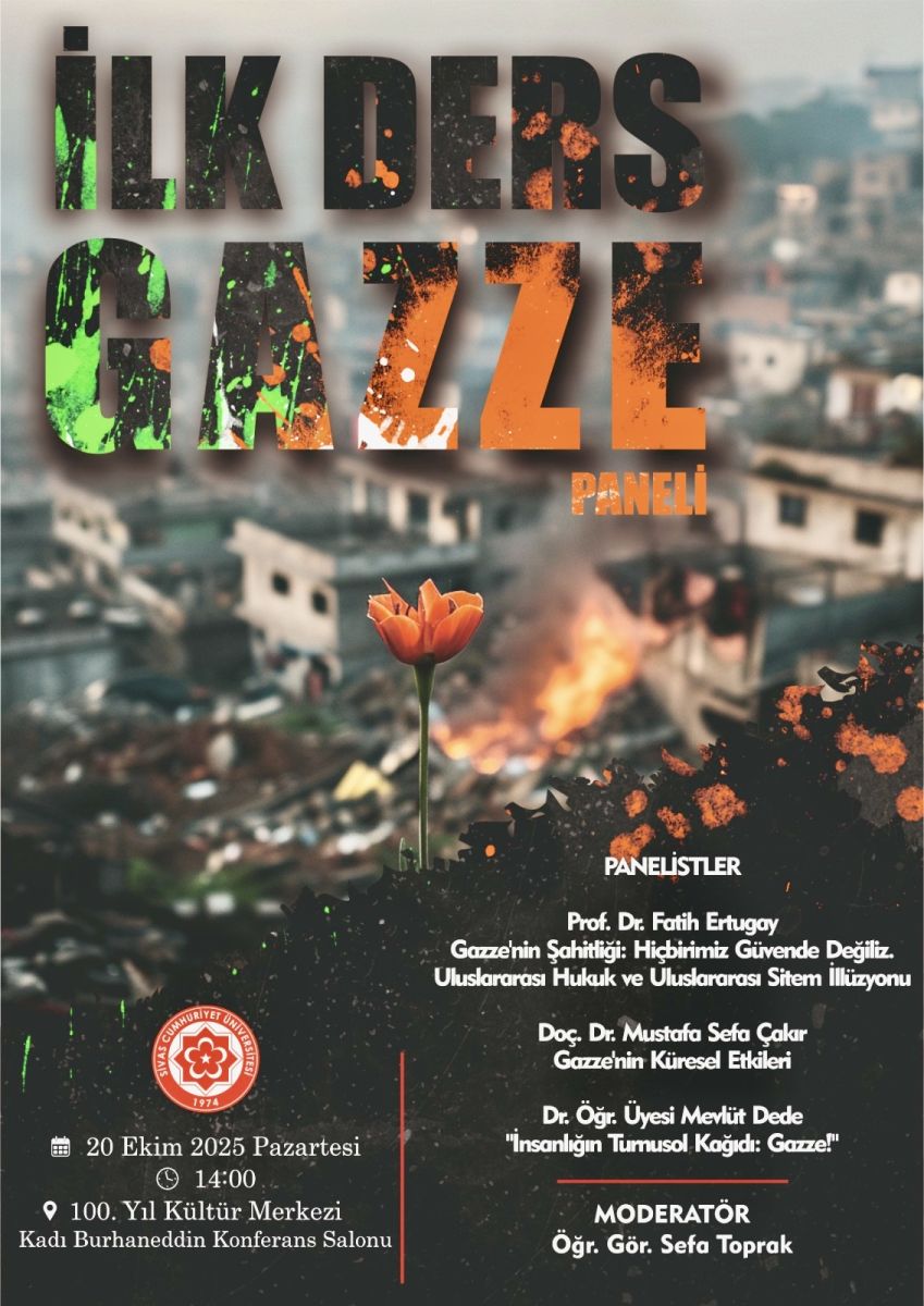 ''İlk Ders Gazze'' konu başlıklı panel programı 20 Ekim 2025 Pazartesi günü saat 14.00' te 100. Yıl Kültür Merkezi Kadı Burhaneddin Konferans Salonunda gerçekleştirilecektir. Programa öğrencilerimizin katılması.
