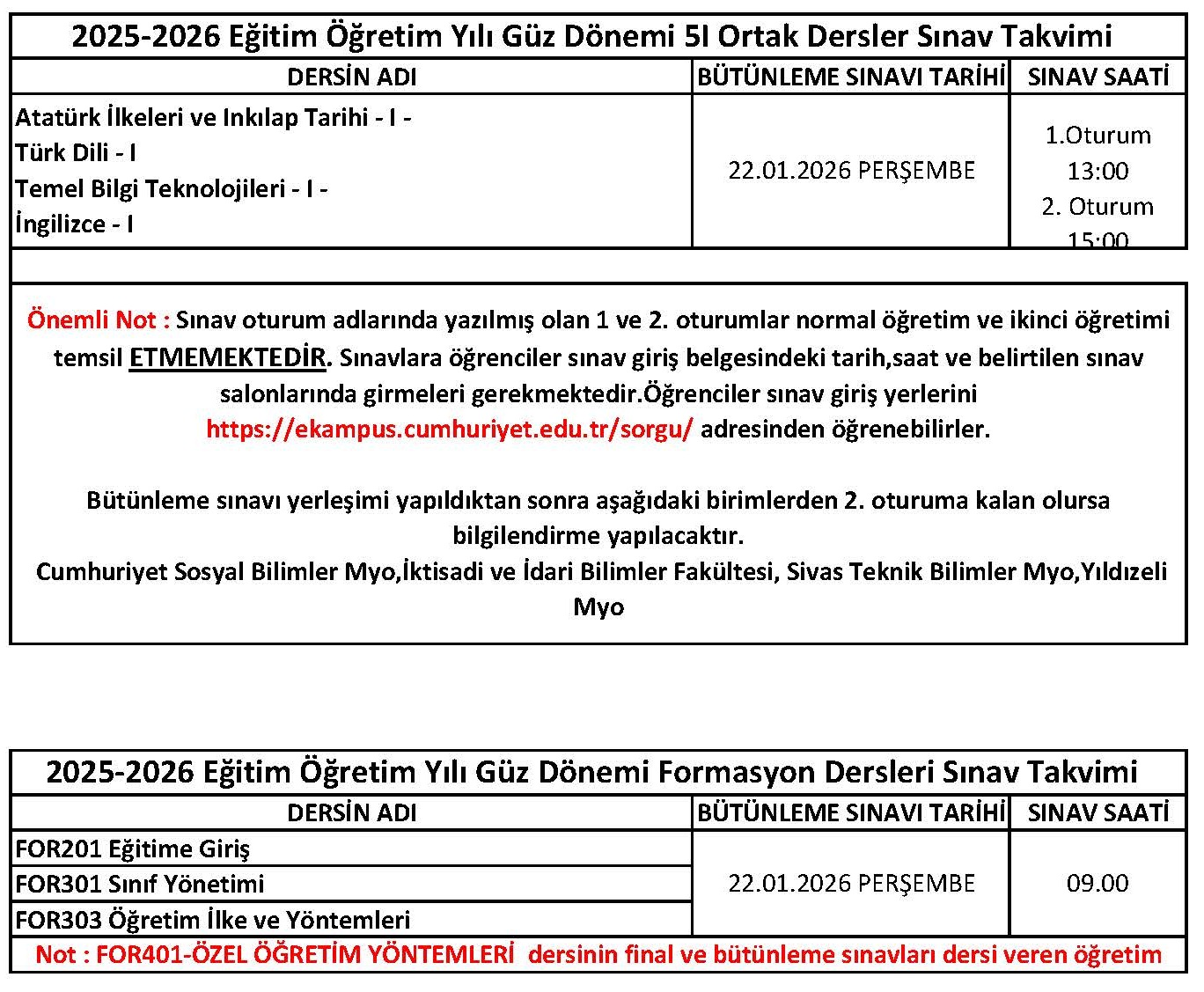 2025-2026 Eğitim öğretim yılı güz dönemi 5i ortak derslerin Final Sınav Tarihi