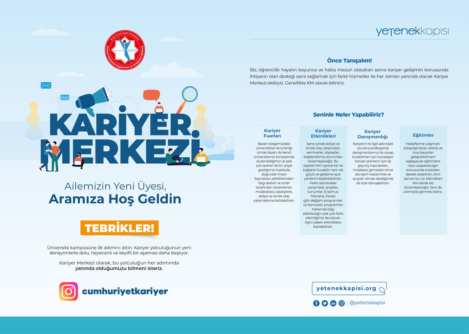 Üniversitemizde eğitim gören öğrencilerin Cumhurbaşkanlığı İnsan Kaynakları Ofisi tarafından geliştirilen "Yetenek Kapısı" portalına (https://www.yetenekkapisi.org/) üye olmaları "İş/Staj İlanları, Etkinlikler, Kariyer Fuarları, Kariyer Danışmanlığı ve Diğer Duyurulara" kolaylıkla ulaşılabilmeleri için önem arz etmektedir. Bu kapsamda Üniversitemiz öğrencilerinin "Yetenek Kapısı" portalına kayıt olmaları gerekmektedir. Bu yıl yeni başlayan tüm öğrencilerimizin yanı sıra öğrenimlerine devam edip Yetenek Kapısına henüz kayıt olmayan öğrencilerimizin de kayıt olmaları gerekmektedir.