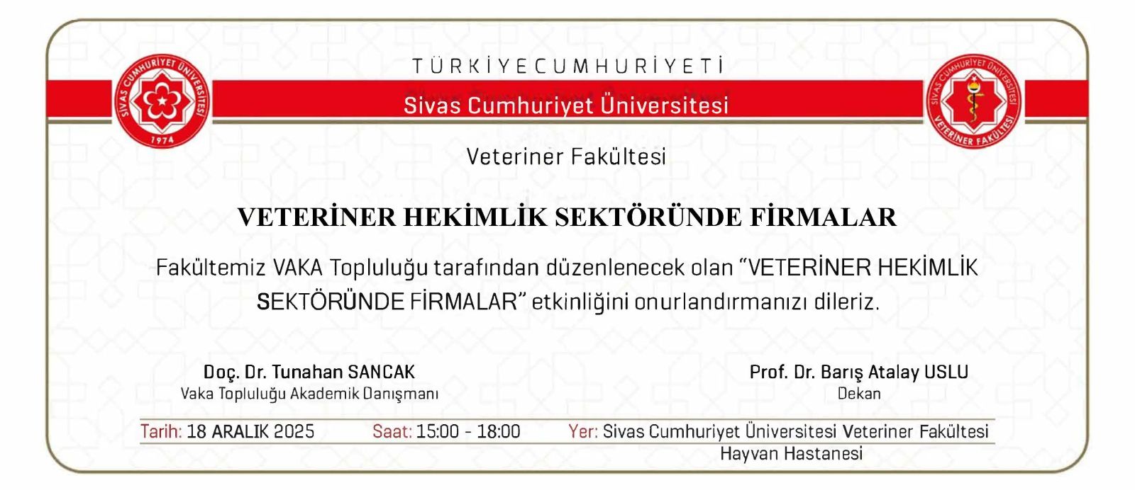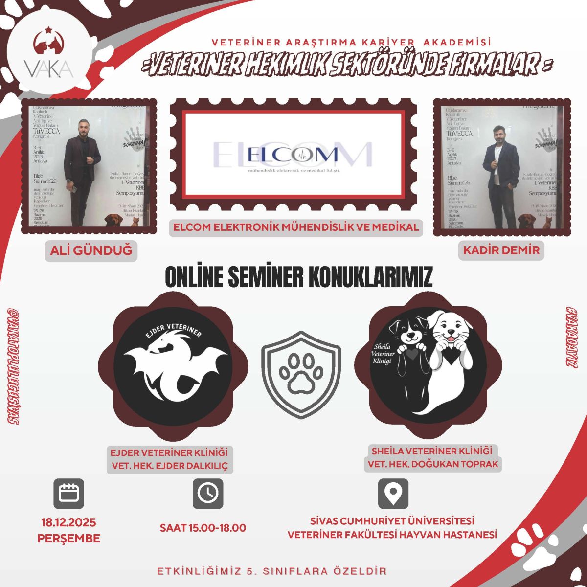 VAKA öğrenci topluluğu etkinlikleri kapsamında 18.12.2025 tarihinde "Veteriner Hekimlik Sektöründe Firmalar" adı altında Sivas Cumhuriyet Üniversitesi Veteriner Fakültesi öğrencilerinin sektördeki firmaları tanıması, medikal ürünlerle ilgili bilgi alması ve ürünleri deneyimleyebilmesi için bir etkinlik planlanmaktadır. Planlanan etkinlik için Elcom Elektronik Mühendislik ve Medikal isimli şirket saha da en çok ihtiyaç duyulan klinik cihazlarla ilgili 18.12.2025 tarihinde 15.00-18.00 saatleri arasında Sivas Cumhuriyet Üniversitesi Veteriner Fakültesi Hayvan Hastanesinde ürün tanıtımı ve bilgilendirmesi yapacaktır.