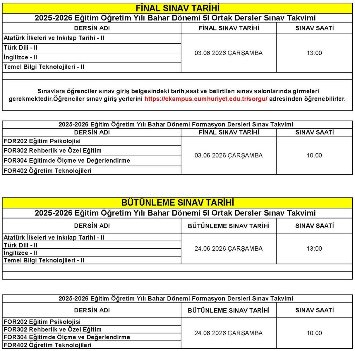 2025-2026 Eğitim-Öğretim Yılı Bahar Dönemi Formasyon Dersleri ve 5i Ortak Derslerin Final ve Bütünleme Sınav Takvimleri