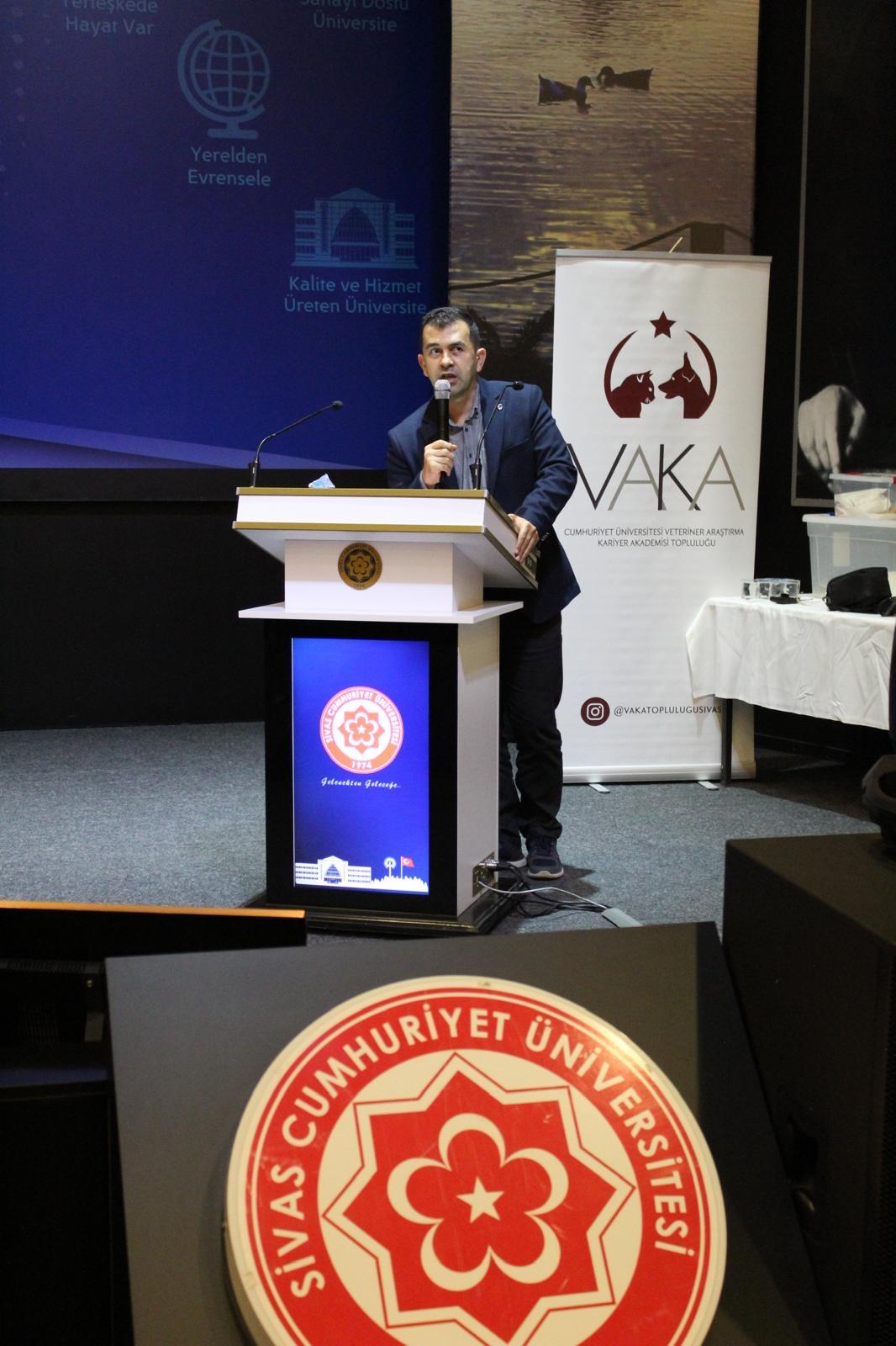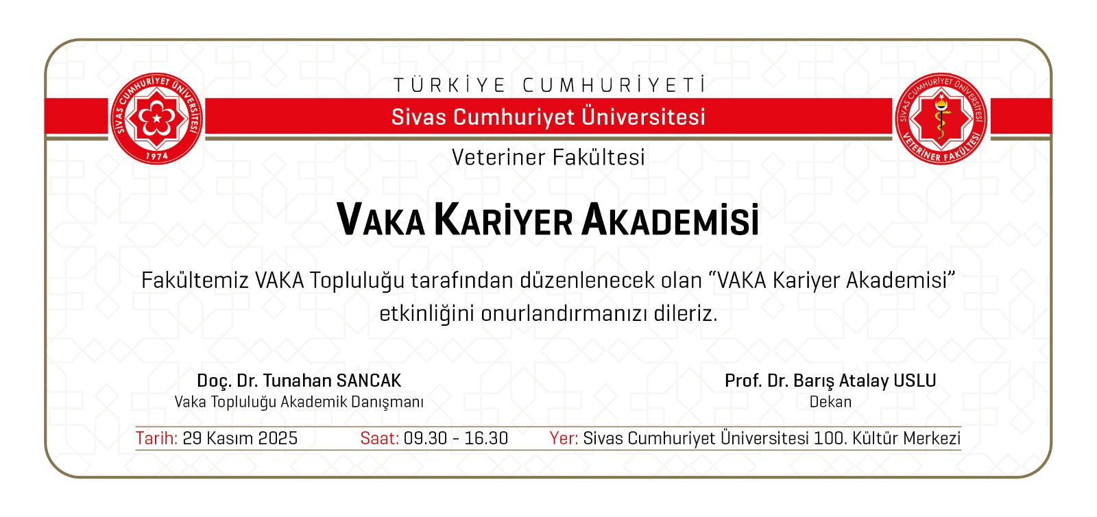 Sivas Cumhuriyet Üniversitesi Veteriner Fakültesi Öğrenci kulüplerinden VAKA topluluğu 29.11.2025 tarihinde "VAKA KARİYER AKADEMİSİ" etkinliği kapsamında çeşitli üniversitelerden Veteriner Hekimliğin farklı iş alanlarında çalışan Hekimleri bir araya getirildi. Bu kapsamda 100. Yıl Kültür Merkezinde gerçekleştirilen ve gün boyu süren etkinlikte, açılış konuşmalarını VAKA Kulübü Başkanı 4/A şubesinden Atakan KAZAN, VAKA Kulübü Akademik Danışmanı Doç. Dr. Tunahan SANCAK ve Veteriner Fakültesi Dekanı Prof. Dr. Barış Atalay USLU, tarafından yapılmıştır. Farklı sektörlerden alanında uzman, deneyimli veteriner hekimler olan davetli konuşmacılar; Veteriner Hekim Dilan ÖZER "Büyükbaş Hekimliğinde Kadınların Yolculuğu" adlı konuşmayla, Veteriner Hekim Melih Gazi GENÇ "Kariyer Yolculuğum: Deneyim, Karar, Yön" adlı konuşmayla, Veteriner Hekim Oğuz ÇALIŞKAN "Kariyerinizin Kontrolü Sizde Olsun" adlı konuşmayla, Veteriner Hekim Abdurrezzak TAŞATAN "Veteriner Hekimlikte Tanının Gücü: Doğru Sonuç, Doğru Karar, Doğru Tedavi" adlı konuşmayla, Veteriner Hekim Burak UÇAR "Kuş Hekimliği ve Yardımcı Tanı Tetkikleri" adlı konuşmayla, Veteriner Hekim Erol TURAN "Sürüngenlerde En Sık Karşılaşılan Hastalıklar ve Acil Vakalar" adlı konuşmayla etkinliğimize katkı sunmuşlardır. Bilgilendirme, soru-cevap şeklinde geçen konuşmaların ardından sponsorların verdiği hediyelerin çekilişi yapılmış ve etkinlik sonlandırılmıştır. Etkinliğe ayrıca Veteriner Fakültesinden farklı bölümlerden öğretim üyeleri de katılarak dinleyici olarak katkı sağlamışlardır. Etkinliğimiz Veteriner Fakültesi öğrencilerinin fakülte sonrası hayatları için yön vermeyi amaçlayan, fakültede okurken kendilerine hedef belirlemelerine yardımcı olmak için gerçekleştirilmiş ve öğrencilerden alınan dönütlerde etkinliğin amacına uygun olarak gerçekleştirildiği de görülmüştür. Etkinliğimize destek veren Sivas Cumhuriyet Üniversitesi Rektörlüğüne ve Veteriner Fakültesi Dekanlığına teşekkür ederiz.